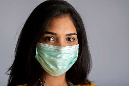 Closeup portrait of a young girl or woman wearing a medical or surgical mask