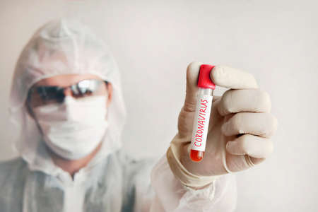 a man in a medical protective mask holds a test tube with the inscription Coronavirus