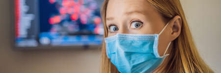 Young woman checks coronavirus sars-cov-2 covid-19 global cases situation online. Coronavirus outbreak in United States of America and World BANNER, LONG FORMAT