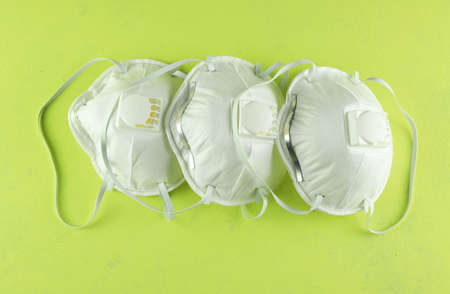 Corona virus concept. Medical protective masks isolated on green background. Prevention of the spread of virus and epidemic. Top view.