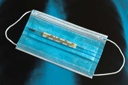 thermometer with high value and antivirus mask on blurred background of chest x-ray