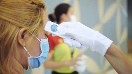 Covid temperature scanning a man head or healthcare worker doing protocol, routine checkup of patient arriving at the airport or border. Traveling refugee or foreign man with face mask in quarantine