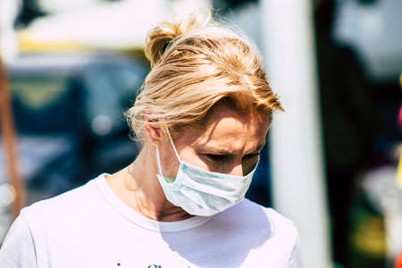 Limassol Cyprus March 14, 2020 View of an unidentified people with a face mask to protect themselves from the coronavirus shopping in the Limassol market in the morning