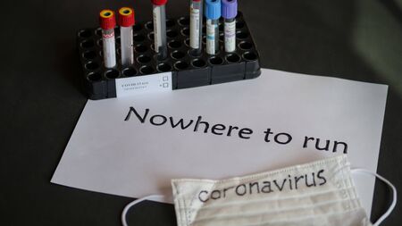 Coronavirus, nowhere to run. Medical test tubes are in the organizer. An inscription on a white sheet of paper. Medical disposable gauze bandages are on the table. A mercury glass thermometer is placed on a protective medical mask.