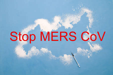 red stop inscription coronavirus, MERS CoV blue background, country silhouette made of white powder, coronavirus epidemic concept, copy location, world map