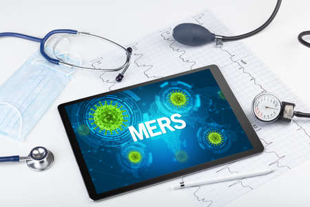 Close-up view of a tablet pc with MERS inscription, microbiology concept