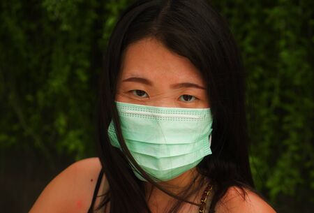 outdoors portrait of young beautiful and attractive Asian tourist woman wearing protective face mask in prevention versus coronavirus outbreak