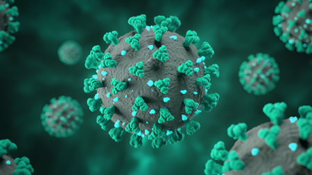 A striking close-up visualization of coronavirus particles, showcasing detailed structures and colors against a vibrant background. Ideal for educational use.