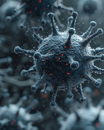 A vivid 3d depiction of a round pathogen with striking red protrusions, set against a gentle gradient of blue and purple hues for scientific and educational use.