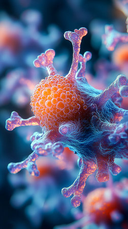 A mesmerizing close-up view of virus particles under a microscope, where scientific accuracy meets abstract art. The intricate details and vibrant colors perfect for educational, editorial