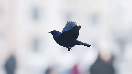A Brewer's Blackbird in mid-flight, wings spread, captured against a soft, blurred background of urban figures, creating a sense of movement and freedom.