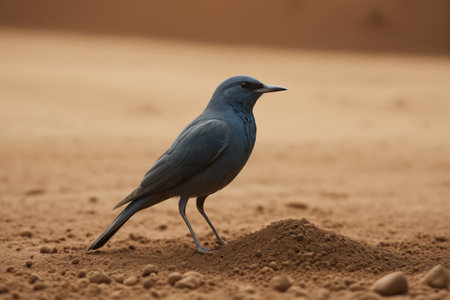 a black bird stands in the desert, captured in a stunning ray tracing style photograph. the matte finish adds depth to the richly detailed backgrounds. this creative commons attribution image features text and emoji installations, creating soft and romantic scenes with a touch of irony and humor. ai generated