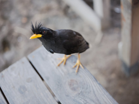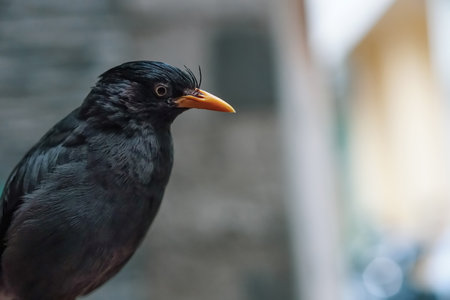 Close-up of Jalak kebo (Acridotheres javanicus) or Javan Myna standing outside the house