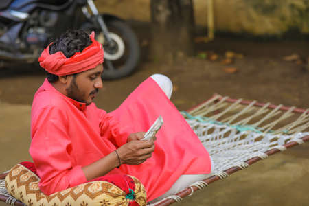 young indian farmer counting money at home