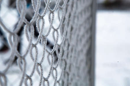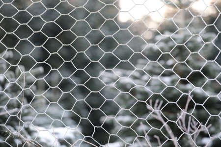Fence of metal mesh covered with frost. The sun shines early in the morning on the frozen grid. The concept of freedom behind a frozen metal mesh under the light of the sun. Cold winter morning.