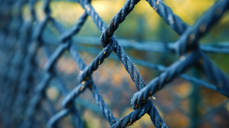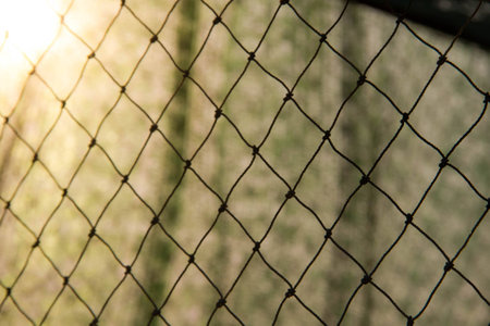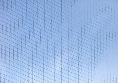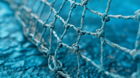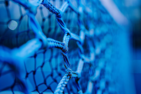 Digital image of close up of a blue tennis net with a blurred background, in a flat lay composition, with macro photography, from a low angle shot, with soft light, with professional color grading, as a stock photo, with high resolution, with sharp focus, with no contrast, with a natural look.