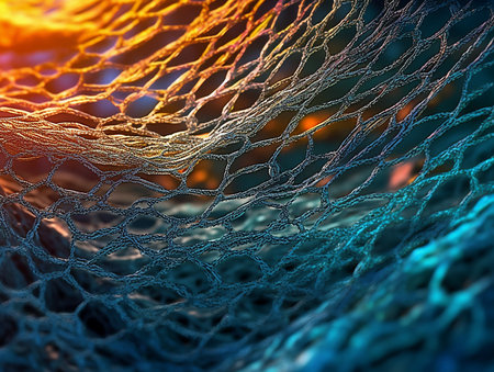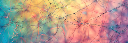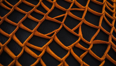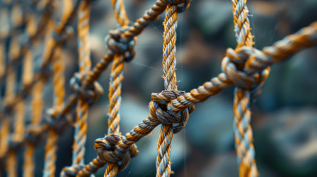 Close-up shot of vibrant ropes knotted together creating a colorful grid pattern, showcasing texture.