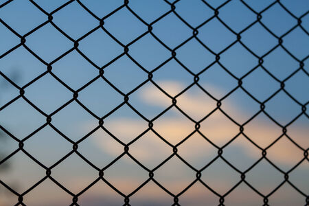 metal mesh fence. sea at sunset behind the net. restraint of liberty