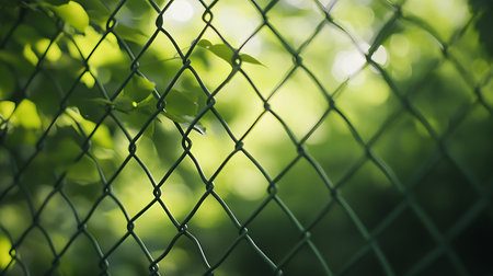 This close-up depicts the intricate weave of a green metal wire fence, adorned with scattered green leaves, set against a blurred sunny backdrop. The interplay of light and shadow enhances depth.
