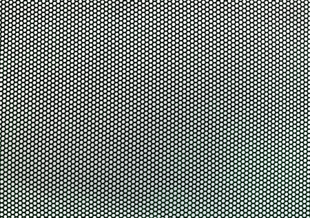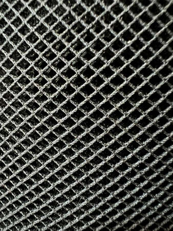 Background image of shiny mesh on dark backdrop. Metallic texture of grid close-up. Triangular shape of grid. Abstract image of surface of audio speaker in macro photography. Futuristic design.