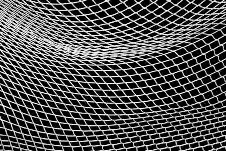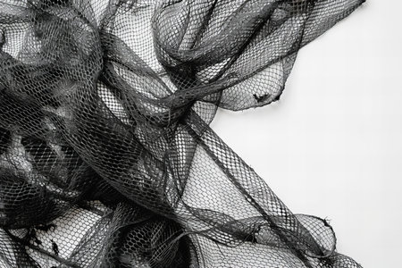 Black fishing net pattern on white background, flat lay, wide angle lens