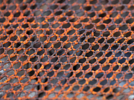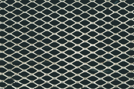 Dark metal fence grid with pattern of numerous small shaped cells installed on light blurred background extreme close view