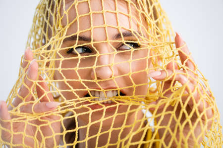 Close-up portrait of a beautiful girl in the red net.