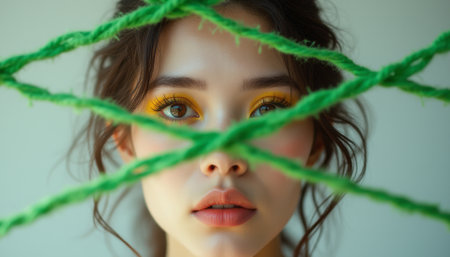 A striking close-up of a woman with mesmerizing yellow eye makeup, partially obscured by vivid green yarn. The image beautifully contrasts her soft features with the bold colors, evoking a sense of intrigue and artistic expression.