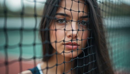 Captivating young woman gazing through a tennis net
