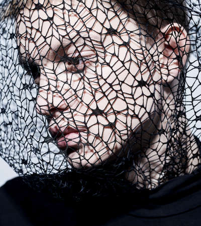 Art portrait of a young man fashion model posing in black turtleneck and with black mesh fabric on his head. Male beauty and fashion.