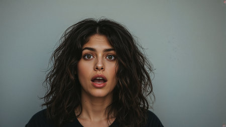 Image is a portrait-style photograph featuring a person with long, voluminous, curly dark hair against a plain gray background. The individual has a medium skin tone and is displaying a surprised expression with wide eyes and an open mouth. The lighting is soft, highlighting the facial features and hair texture. The person is wearing a dark-colored top, and the overall composition is centered, focusing on the subject's face and expression. The image conveys a sense of surprise or shock, with the background providing a neutral contrast to the subject's expressive features.