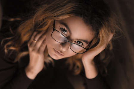 Beautiful girl looks piercing eyes into the camera. Hair flying. Drama. Studio photography in low key on a background