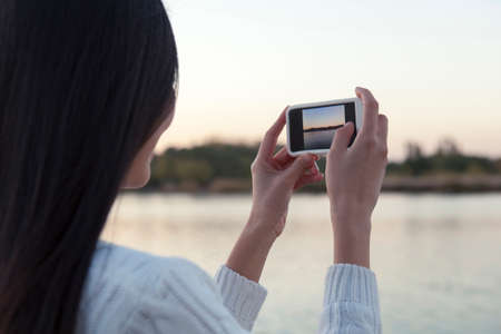 Over shoulder view of young woman photographing river at dusk, Beijing, China