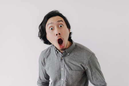 Surprised wow Asian businessman face in grey shirt isolated on white background.