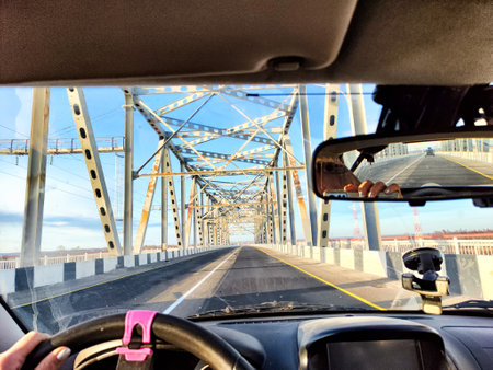 A driver approaches a steel bridge, framed by blue skies and open road, showing the structure's intricate design.