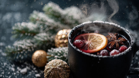 A cozy close-up of a dark mug filled with a festive winter drink, garnished with fresh cranberries, a slice of orange, and a star anise pod. The scene is set with frosted pine branches and golden ornaments, evoking a holiday atmosphere.