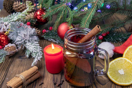 Mulled wine in a glass mug with spices. Christmas hot drink on a wooden table. View from above.