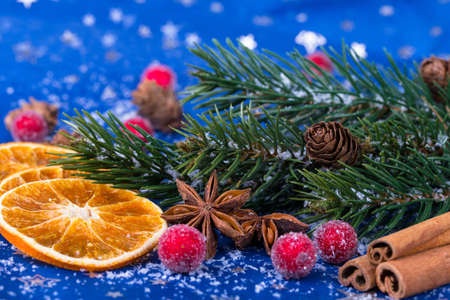 Christmas Tree Pine Branches with dry oranges. cinnamon, anise, pine on a dark background.