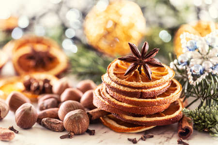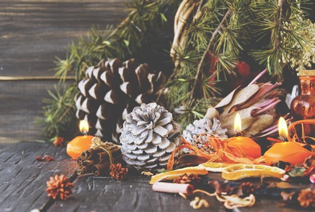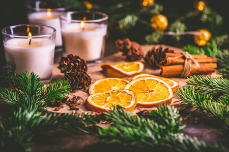 Dried orange and Christmas spices with branches of christmas tree, cinnamon, candles on kitchen table