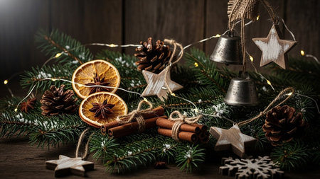 Christmas still life with fir branches, cinnamon, dried oranges and christmas decorations on wooden background