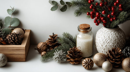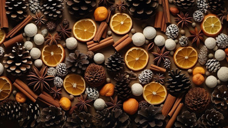 A captivating arrangement of seasonal elements featuring pine cones, spices, citrus slices, and festive ornaments, perfect for holiday decor inspiration.