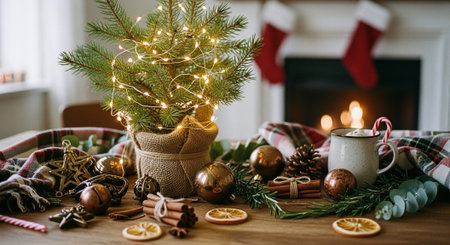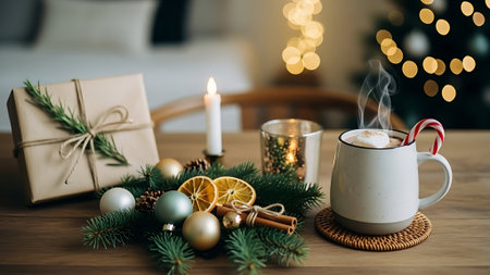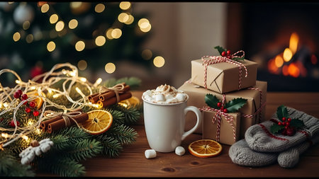 A cozy holiday scene featuring a decorated christmas tree, wrapped gifts, a cup of hot chocolate with whipped cream, and a vase with greenery on a wooden table