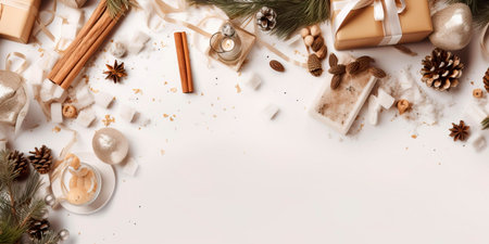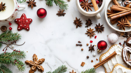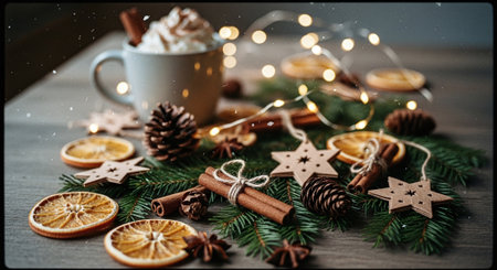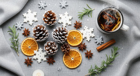 A delightful overhead view of a warm beverage amidst festive holiday elements like pinecones dried orange slices and delicate snowflakes creating a charming seasonal atmosphere.