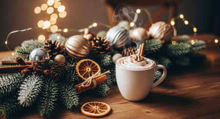 A cozy winter scene with a cup of hot chocolate topped with whipped cream and cinnamon sticks, surrounded by festive decorations like pine cones, ornaments, and dried orange slices, with soft lights.
