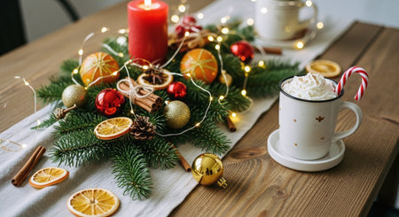 A festive holiday table setting with a cup of hot chocolate topped with whipped cream and a candy cane, surrounded by Christmas decorations including oranges, pine branches, and candles