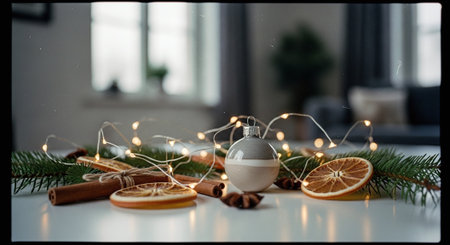 A festive arrangement featuring a decorative ornament, dried orange slices, cinnamon sticks, and fairy lights on a table with a blurred background