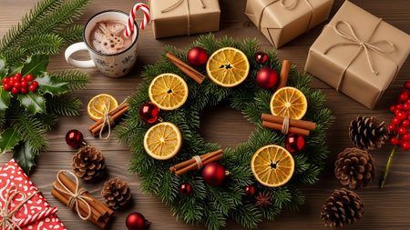 Christmas wreath with hot chocolate, cinnamon sticks, dried orange slices and pine cones on wooden background