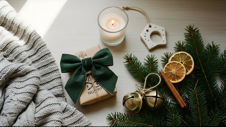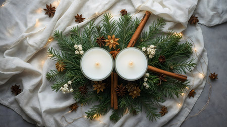 Top-down flat lay of minimalist Scandinavian Christmas decor with candles, evergreen branches, fairy lights and linen fabric. Clean and modern holiday styling.