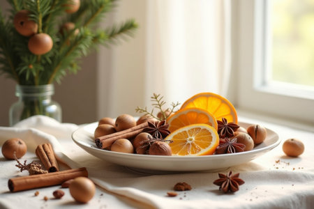 A festive still life displays oranges, nuts, cinnamon sticks, and star anise on a plate, complemented by pine branches in the background.