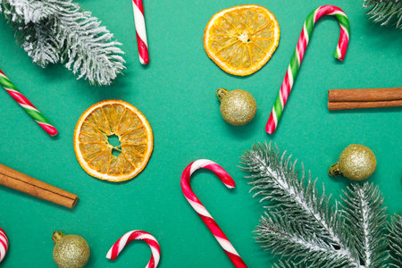 Christmas celebration. Candy canes, spices and festive decor on green background, flat lay